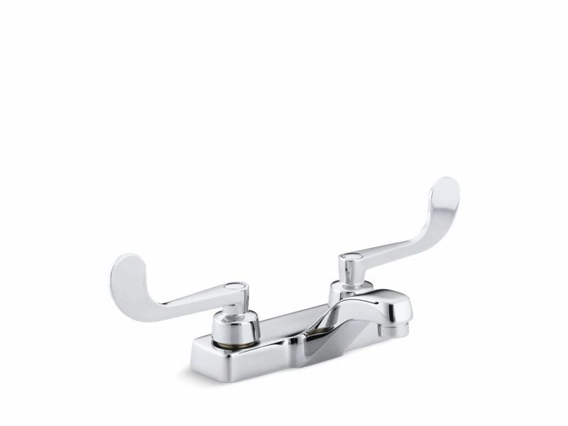With practical design solid Brass construction and a water saving 0.5 GPF (gallons per minute) flow rate this Triton faucet is an exceptional value. Competitively priced Triton faucets feature washerless ceramic valving a durable Polished Chrome finish and vandal resistant index buttons. The two handle centerset faucet with wristblade handles will hold up to years of daily use.