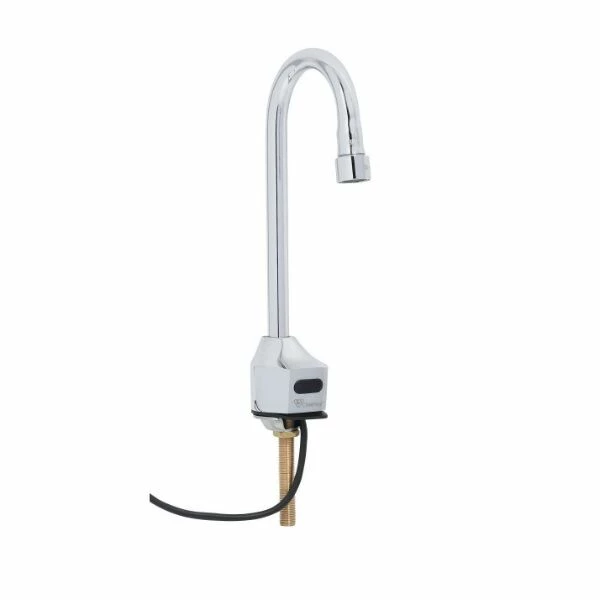 Single hole deck mount electronic sensor faucet with polished chrome plated brass body and 4 1/8″ rigid gooseneck, 2.2 GPM vandal resistant aerator, AC/DC control module with internal flow control setting switches, temperature control mixing valve with check valves and 18″ flexible stainless steel supply hoses with 3/8″ compression connections. Certified to ASME A112.18.1/CSA B125.1, NSF 61-Section 9,NSF 372 and UL 1951. Meets ADA ANSI/ICC A117.1 requirements